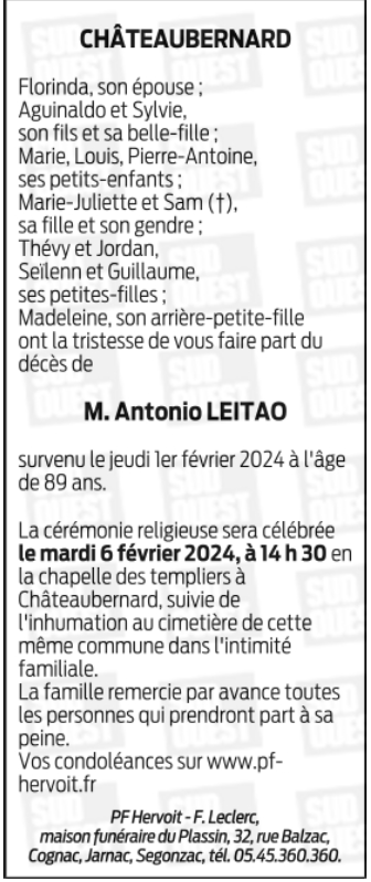 Décédé à Mérignac (16200, France) le jeudi 1 février 2024 à l'âge de 89 ans