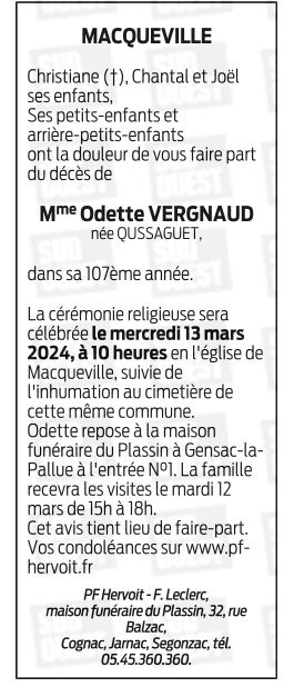Décédée à Mérignac (16200, France) le vendredi 8 mars 2024 à l'âge de 106 ans