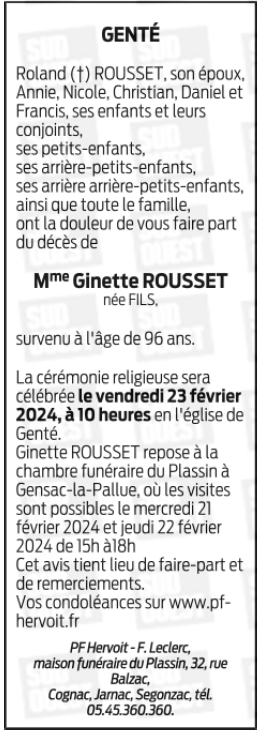 Décédée à Gente (16130, France) le dimanche 18 février 2024 à l'âge de 96 ans