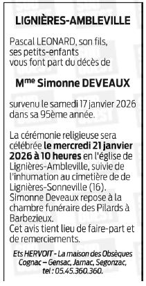 Décédée à Barbezieux-Saint-Hilaire (16300, France) le samedi 17 janvier 2026 à l'âge de 94 ans